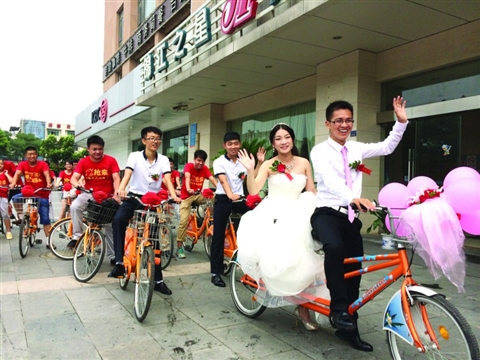 □商報(bào)記者 崔陽陽 文/攝 在蘇州,結(jié)婚車隊(duì)不乏開著寶馬奔馳,抑或更為豪華奢侈的進(jìn)口大牌車??勺蛱欤瑓墙瓍^(qū)的一對(duì)小夫妻,卻選擇了另一種新奇浪漫的方式,公共自行車成了新郎迎娶新娘的另類座駕。盧云龍,剛大學(xué)畢業(yè)的一伙子,用他的汗水和誠意娶上了心目中最美的媳婦?! 墙瓍^(qū)江陵西路的一小區(qū)里,鞭炮、禮杖聲聲入耳,有個(gè)小子要娶媳婦,竟然用的是公共自行車!這個(gè)消息傳遍了整個(gè)小區(qū)。20輛公共自行車整整齊齊地排列在盧云龍家樓下,每輛自行車的車頭還掛著喜氣的紅花,其中最醒目的雙人自行車正是盧云龍迎娶新娘鄭丹的牛氣座駕,粉色的氣球組合在車頭迎風(fēng)飄逸。一大早,吳江區(qū)公共自行車管理中心的工作人員就已經(jīng)把這20輛自行車送到了盧云龍家樓下。工作人員告訴記者,新郎是通過12345市民熱線聯(lián)系到他們的,當(dāng)?shù)弥孕熊囀怯糜诮Y(jié)婚車隊(duì)時(shí),中心決定免費(fèi)為新郎提供,還專門送到家?!斑@也是低碳環(huán)保的一種方式,我們當(dāng)然會(huì)支持?!惫ぷ魅藛T說?! ”R云龍騎著雙人自行車,帶著他的那幫哥們姐們,在酒店迎娶到了他心愛的姑娘鄭丹?!拔依掀攀巧綎|淄博人,所以迎娶前就把她安排在酒店里?!碧鞖獾难谉嶙尡R云龍滿頭大汗,卻掩藏不住他娶媳婦的興奮,被抱上車的新娘鄭丹也是笑靨如花。中山北路、江興西路、西塘河路、江陵西路,自行車迎親隊(duì)一路洋洋灑灑,振臂高呼“新婚快樂”,引起了不少路人的注意。家住嘉鴻花園的畢先生告訴記者,“今天周末起了個(gè)早,沒想到看到用自行車結(jié)婚的新鮮事,現(xiàn)在年輕人了不得?!睋?jù)了解,這次騎自行車結(jié)婚的策劃幾乎都是新郎一人全程策劃。大到和城管聯(lián)系借到公共自行車,小到上淘寶買紅色“搶親”t恤,都是盧云龍一手操辦。“寶馬奔馳的車隊(duì)太多了,我和她想有個(gè)不一樣的記憶,組個(gè)自行車隊(duì)迎娶不僅低碳環(huán)保,也重溫了一把大學(xué)時(shí)光,我倆都覺得很浪漫?!毙吕杀R云龍開朗而熱情。盧云龍和他的新娘鄭丹都是青島農(nóng)業(yè)大學(xué)的大四畢業(yè)生,小夫妻兩人在大一的時(shí)候就相識(shí)了?!澳鞘且淮紊瞎_課,我去得晚,也找不到其他座位,就坐到了她的身邊,就這樣聊了起來?!睕]想到一聊就聊成了一對(duì)眷侶,兩人到大一期末時(shí)就正式走到了一塊。接下來的三年時(shí)光,兩人最美好的回憶,莫過于兩人各騎一輛車去學(xué)校后面的山上玩?!澳蔷褪俏覀兊募s會(huì)。山上有許多果園,我倆一路騎行到山上,付給果農(nóng)50元,里面的蘋果、梨子、櫻桃,有啥都可以摘著吃,每次都盡興而歸?!北R云龍愉快地回憶著?! 〗衲?月兩人同時(shí)從大學(xué)順利畢業(yè),看著周圍的朋友不少畢業(yè)就分道揚(yáng)鑣,相愛的兩人決心給三年的愛一個(gè)完滿的結(jié)局,他們選擇了一畢業(yè)就結(jié)婚?!拔覀儛蹖?duì)方,各方面的條件也成熟,何苦拖時(shí)間為難自己?”盧云龍對(duì)自己的“畢婚”做這樣的解釋?! ?duì)于騎個(gè)自行車就把新娘娶回家的建議,最先提出的是他的妻子鄭丹。那時(shí)新人雙方家長在一起商量車隊(duì)的事,是選用幾萬元的寶馬車隊(duì),還是選擇自家親戚組建車隊(duì),一直爭執(zhí)不下。這時(shí)候新娘鄭丹提了出來,“那干脆用自行車吧?!边@個(gè)建議剛拋出就遭到了父母的反對(duì),“一生難得結(jié)次婚,不用輛好車說不過去,大人們都這么想?!辈贿^最后在小夫妻倆的堅(jiān)持下,父母終于想通了,還得到了家里不少親戚的支持?!斑@小奔子,思想很有創(chuàng)意,以前我們結(jié)婚的時(shí)候是用自行車的,現(xiàn)在他們年輕人又開始流行了,還說寶馬奔馳啥的太土。”盧云龍的舅舅告訴記者,“小奔子”正是盧云龍的小名。(責(zé)編:呂琳)