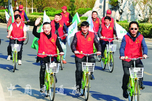 日前,江蘇省張家港市永聯(lián)村公共自行車系統(tǒng)投入使用,村域面積為10.5平方公里、被稱為“華夏第一鋼村”的永聯(lián)村成為全國首個(gè)啟用公共自行車系統(tǒng)的建制村。一些明星也來到村里騎行公共自行車,共同宣傳低碳環(huán)保的出行理念(如圖)。永聯(lián)村公共自行車一期設(shè)立17個(gè)租借點(diǎn),安裝鎖車器500個(gè),投放公共自行車400輛。